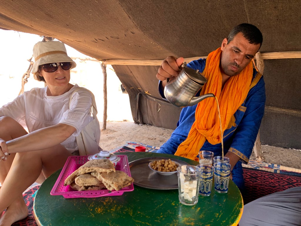 Baked in a traditional oven made out of clay, built on the ground and reconstructed at every new stop, cooked with firewood from local shrubs, and accompanied by traditional Moroccan mint tea and olive oil, it had an unforgettable, crisp taste. Our meal was served in the simplest of tents and accompanied by the warmest of welcomes. Smiles under veils and simple, unrushe gestures, accompanied the hearty welcome.