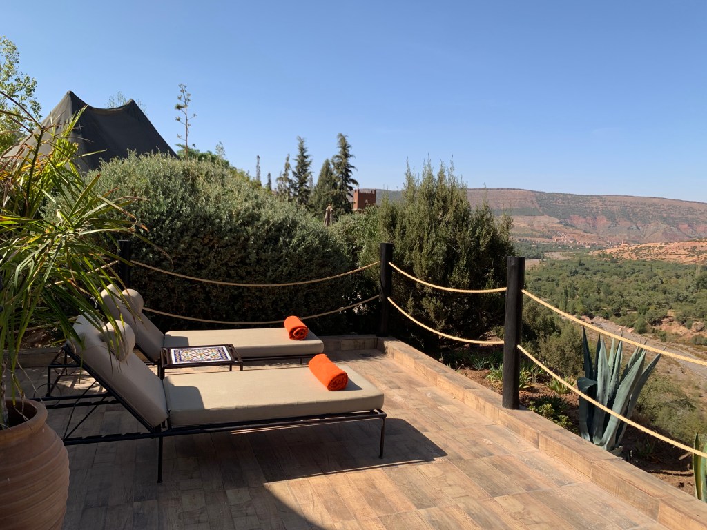 Terrace of a tent with jacuzzi facing the majestic Atlas mountains