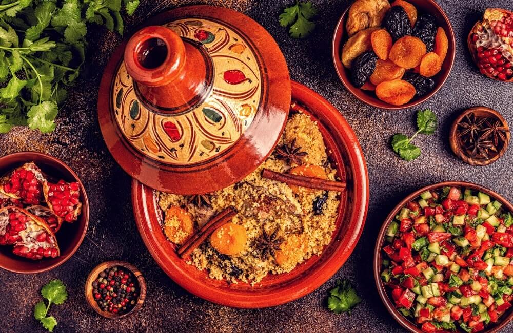 Made with meat, chicken, fish or veggies, combined with olives, prunes, apricots, almonds, raisins or preserved lemons, the tagine is cooked slowly in the thick earthenware dish from which it took its name.