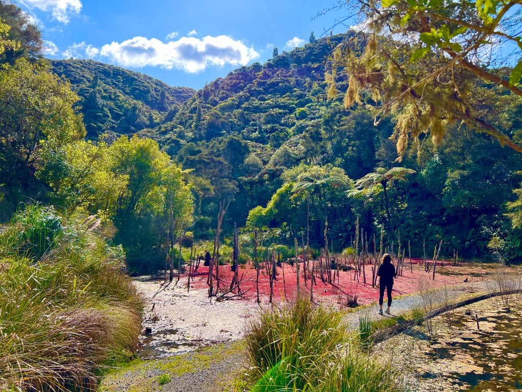 A few km south of Rotorua is the Waimangu Volcanic Valley, where we spent an afternoon hiking through spectacular volcanic craters, enormous hot water springs, beautiful geothermal features, rare and unusual plant life, brilliantly coloured microbiology, and a wide array of birds.