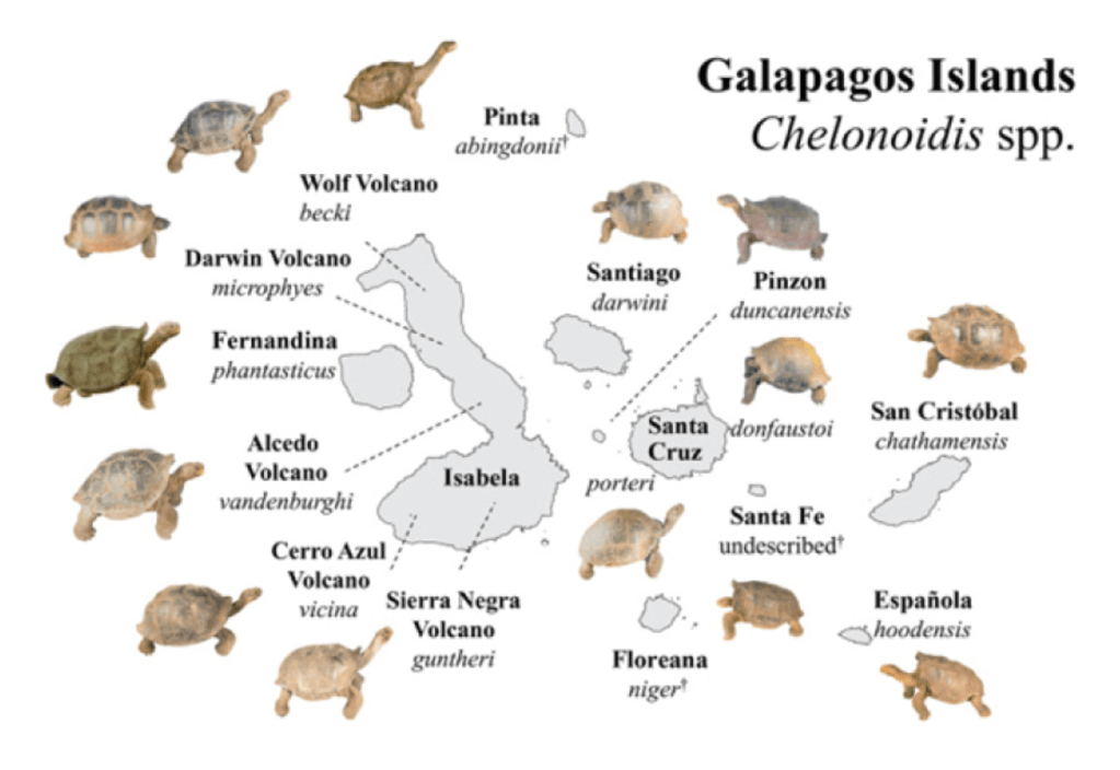 Galápagos giant tortoises: 15 subspecies, several of which are endemic to specific islands.