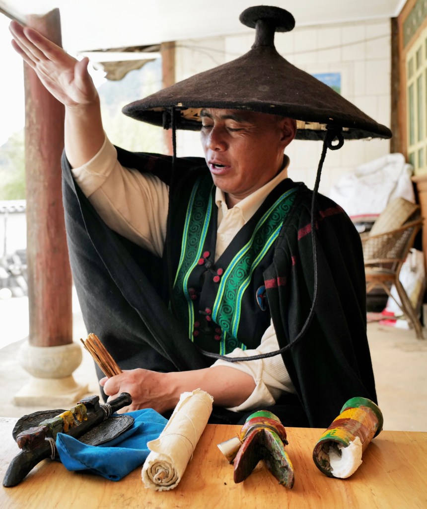 At Wenhai we met Mr. He, the local shaman, who the Yi people call Bimo. Mr. He performed a welcoming ceremony for us and acquainted us with the Yi people’s beliefs.