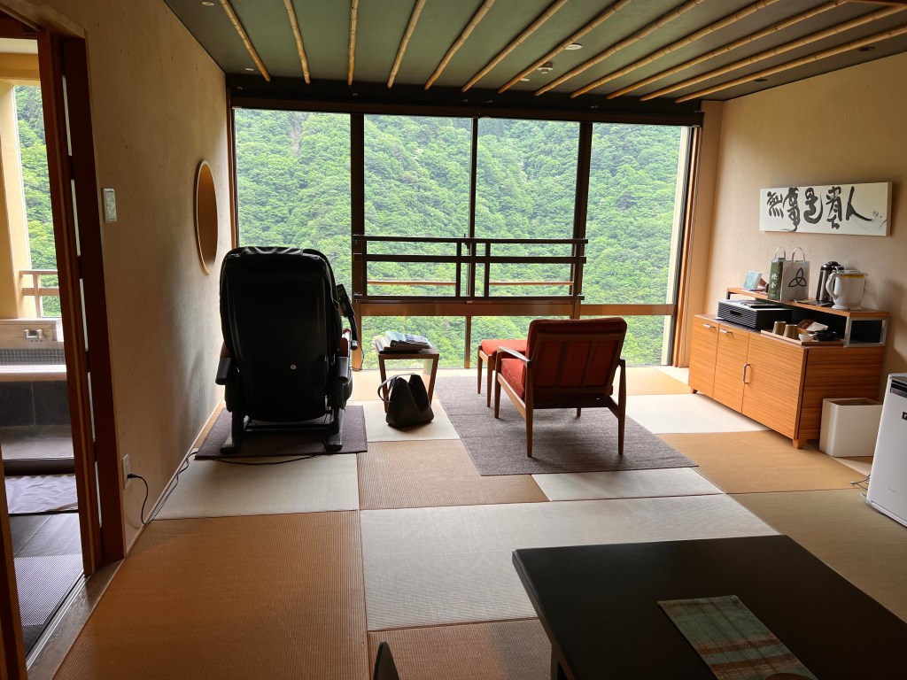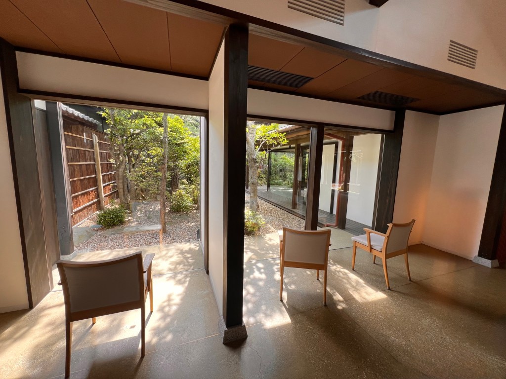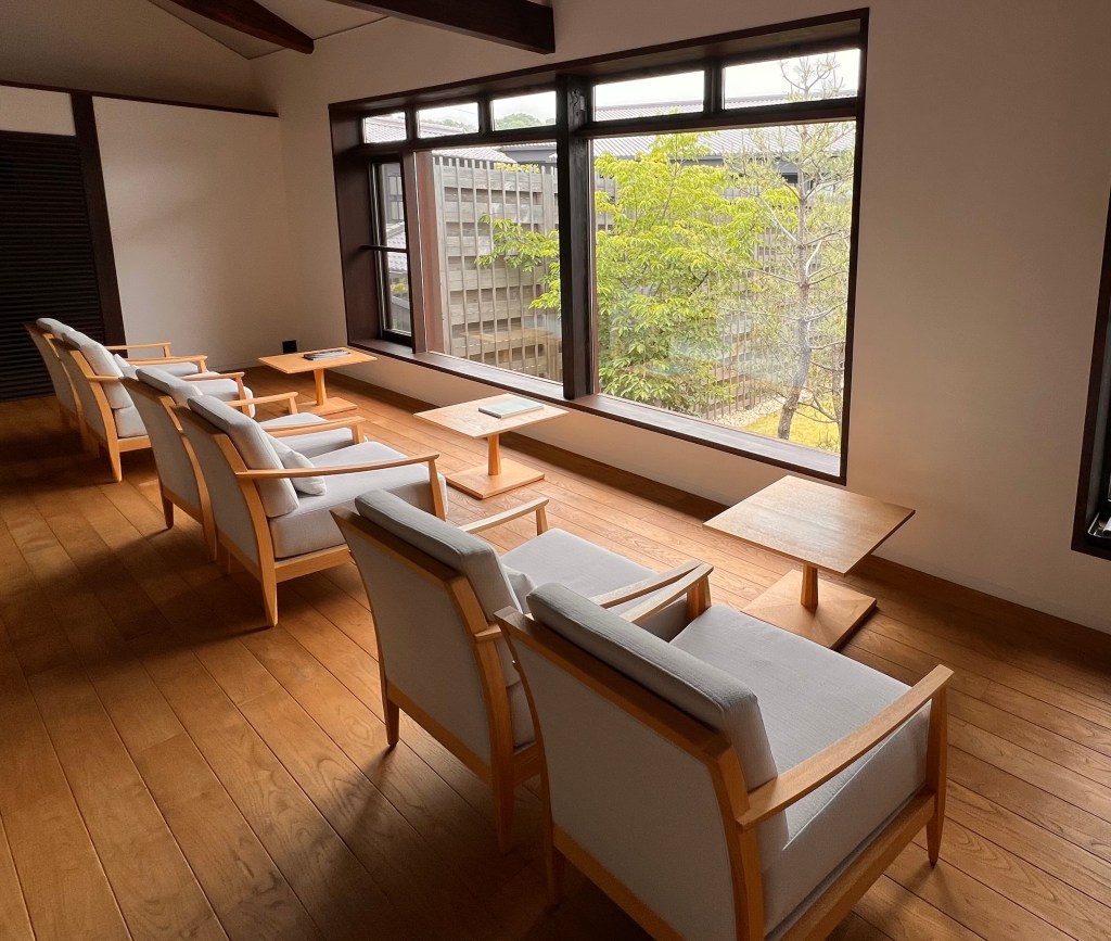 Typically, common areas in Japanese hotels feature no sofas and rarely have chairs that face each other. In fact, in most traditional Japanese hotels you will find single chairs facing towards the outside, never the inside.