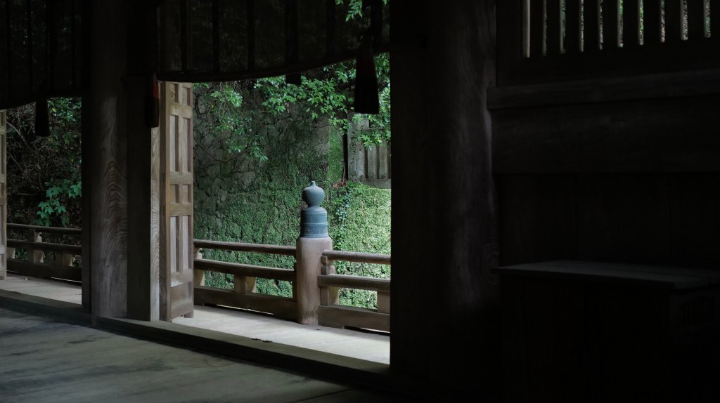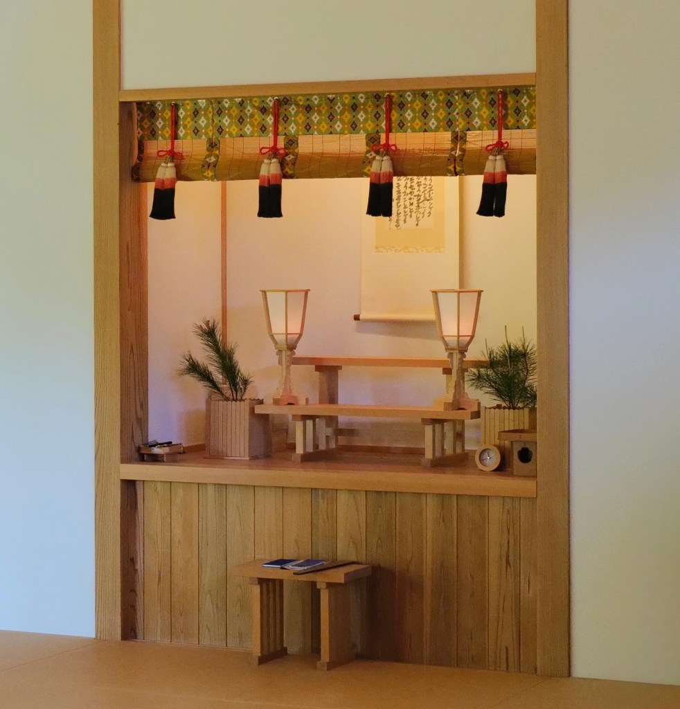 Shinto, Japan’s indigenous religion, emphasises the sacredness of nature and the presence of kami , or deities, in all aspects of life. Central to Shinto rituals is the honden or main shrine, where the goshintai or sacred object representing the deity, is enshrined. This object can take various forms, such as a mirror, a sphere, or a small shrine, symbolising the divine presence. Often there is no object of devotion at all, the shrine just shows an empty altar or a closed altar door, the shrine emodying the “spirit” of the kami (or of all kamis).