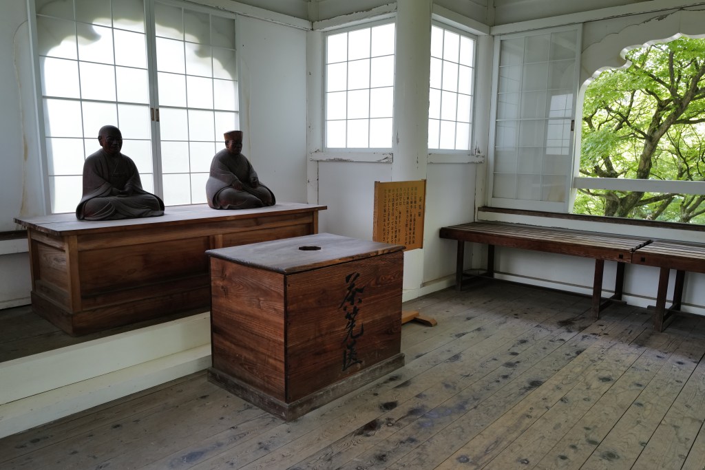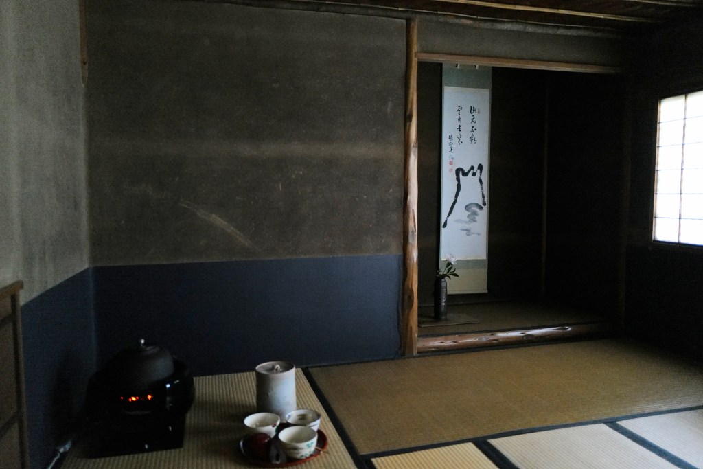 - Tea ceremony: Tea was initially introduced to Japan from China by Zen monks, in order to help them stay awake during long hours of meditation. As Zen spread from the temples to the samurai class, the tea ceremony evolved into a highly ritualised practice that embodied the principles of Zen, but also, with its detailed steps and codified rules, greatly spoke to the samurai’s sense of order. Tea houses, where the ceremony still takes place today, were designed to be austere, with minimal decoration. This simplicity is intentional, as it allows participants to focus on the experience of the tea itself rather than being distracted by ornate objects. A typical tea room might feature a single scroll with a bold, calligraphic message and a few flowers. The scroll often contains a Zen saying, the most famous of which is “Ichigo Ichie,” which means “One time, one meeting,” something the samurai would typically value. The tea ceremony also reflects Zen’s appreciation for simplicity and imperfection. The ceramic bowls and other tools used in the ceremony are often humble and unrefined, in contrast to the elaborate and ornate ceramics used by the court. This aesthetic, known as wabi-sabi, celebrates the beauty of the imperfect and the transient, which fits well with the samurai ethos (see section below on the Tea Ceremony).