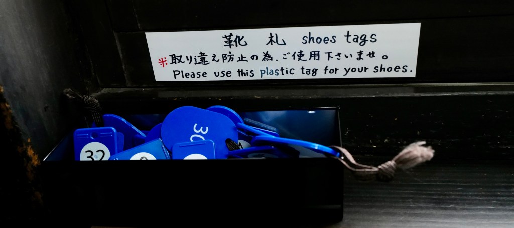 As you enter: Remove your outdoor shoes in a specially designed area called genkan and put on standard slippers. Make sure you tag your shoes before leaving them in a specially designed area (without a tag, someone else might take them!).