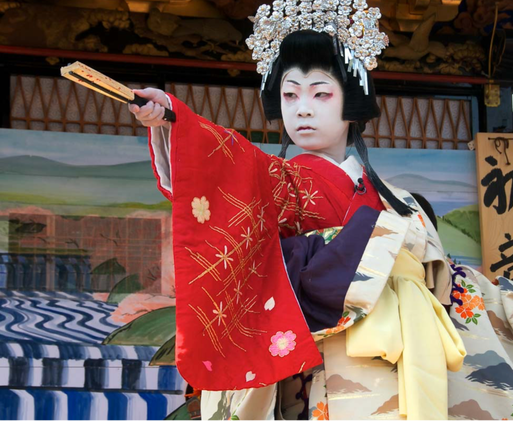 - Kumadori makeup: Bold, symbolic makeup for male roles, with colours indicating traits (e.g., red for heroism, blue for villainy).