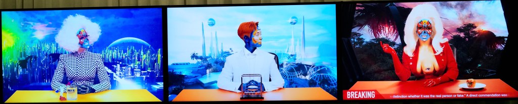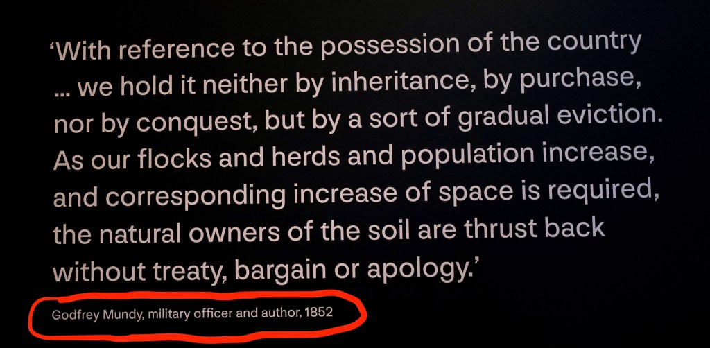 “The first meeting”, a powerful work of art by contemporary artist Brook Andrew. The “meeting” was rarely a fair exchange; it was the start of an invasion and brutal colonisation. The title invite a critical reading of what really transpired when European explorers and Aboriginal people first met.