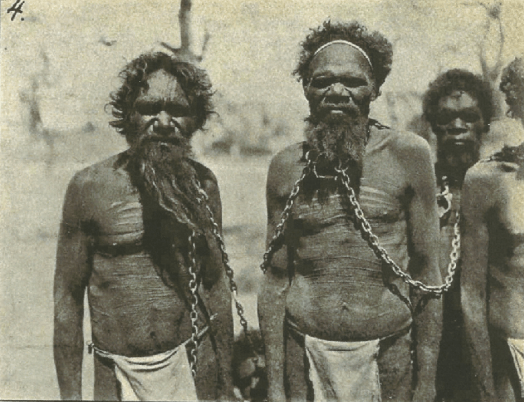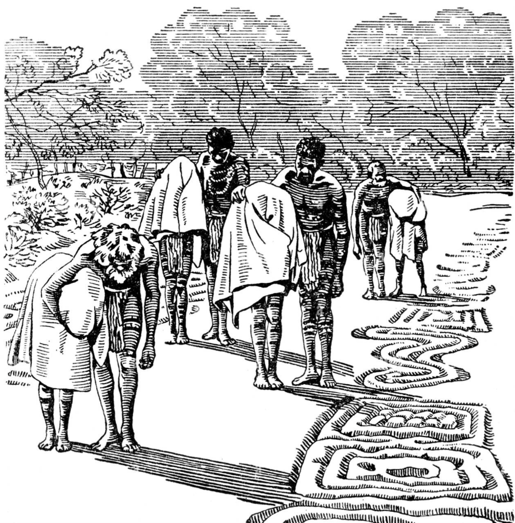 Example of a Bora Ceremony, a traditional Aboriginal ritual for boys, marking their transition to manhood. The name “Bora” also refers to the ceremonial grounds where the rituals took place, which typically feature two rings of hardened earth connected by a path. During the ceremony, which could last for weeks, boys were taught sacred songs, dances, and tribal lore, and underwent physical rites like scarification, circumcision or extraction of one of the frontal teeth.