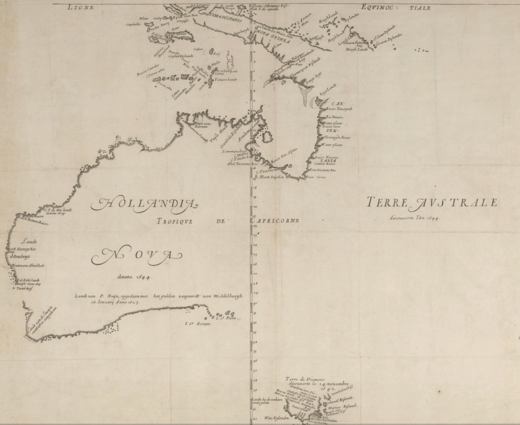 One of the earliest maps of Australia, dating from 1644, showing parts of western parts of the continent and, at the bottom, what is now Tasmania.